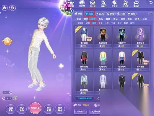 2、点击选择服饰-套装(发型、上身、下身等也可以)。