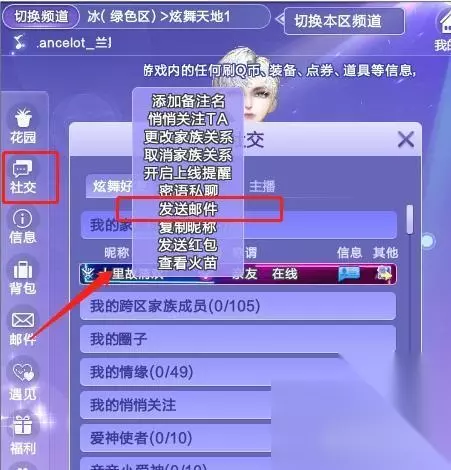 QQ炫舞中G币的用途很少,同一个大区的玩家之间可以使用邮箱相互赠送,也可以玩家个人来购买服饰和道具装备。 一、赠送 1、玩家选择想要赠送的好友,然后右键点击好友,玩家与好友必须所属同一个大区,然后点击【发送邮件】。
