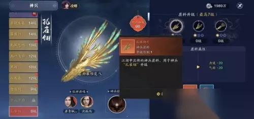 天涯明月刀手游神兵孔雀翎获取途径 1、每次参加地字以上帮会联赛可以得到一个。 2、通过分/总舵/中立领地胜利可以得到神兵孔雀翎。 3、还可以通过开金/银色珍稀礼盒概率得到神兵孔雀翎。 神兵孔雀翎效果: 1、神兵孔雀翎有21级,升级可以带来会心/暗伤+会心/暗伤抵抗率。 2、并且还额外附带主动技能【淬羽之光】,可以带来800%的攻击力伤害