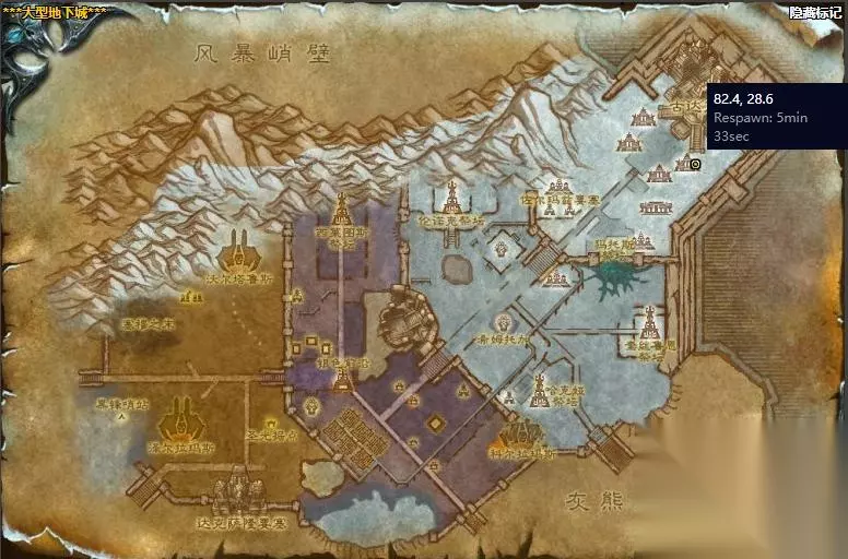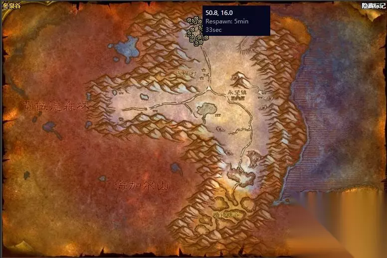 3、然后我们传送到冬泉谷,在北部(50.8,16.0)击杀各种带有霜刃豹词条的野怪。