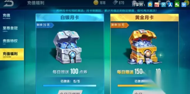 4.充值活动1.白银月卡,每日赠送100点券2.黄金月卡,每日赠送150点券+10钻石。