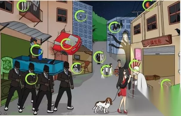 答案分析 1、滑动打开卷帘门,可以找到【事发现场】,老爷爷卖的是【骨爪】,远处走来了【黑白无常】,排队的人是【半透明】的,电线上有【吸血鬼】,天上是【红色月亮】,左边窗户有【倒吊人影】,下面有【僵尸】,左边的写字楼有【掉落人影】,左边还有【僵尸】。 小编点评: