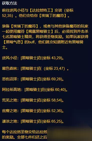 飞弹连射: 1、前往逆风小径与[达拉然特工]交谈 (坐标52,35) 。他们会给你[埃瑞丁的魔符]。 2、装备[埃瑞丁的魔符],或者与其他装备魔符的玩家一起使用魔符[揭露黑暗骑士]。 3、必须找到并击杀七名黑暗骑士精英,将获得圣物奖励。 4、如果玩家获得[黑暗气息]的buff,他们就会知道附近有黑暗骑。 逆风小径:[黑暗骑士]在(坐标 43,29). 暮色森林:[黑暗骑士]在(坐标 23,47) 悲伤沼泽:[黑暗骑士]在(坐标 69,28). 阿拉希高地:[黑暗骑士]在(坐标 60,40)。 荒芜之地:[黑暗骑士]在(坐标 58,54) 贫瘠之地:[黑暗骑士]在(坐标 52,36)。 凄凉之地:[黑暗骑士]在(坐标 65,25). 5、每个达拉然圣物交给达拉然特工都能获得经验和金币的奖励。全部七件归还之后,玩家将获得这个符文