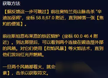 炽热连击: 1、前往奥特兰克山脉击杀“辛迪加巫师”,坐标 58.8,67.0 附近,直到掉落一张[焦灼的便笺]。 2、前往斯坦恩布莱恩的铁匠熔炉 (坐标 60.0 46.4 附近)。 3、到达那里后,可以看到两个连接在锻造屋外部的风箱。 4、对它们使用[烈焰风暴]等火焰法术,直到他们发出红光并燃烧。 5、一旦两个风箱都着火,就会生成一个[远古火元素],击杀以获取符文。