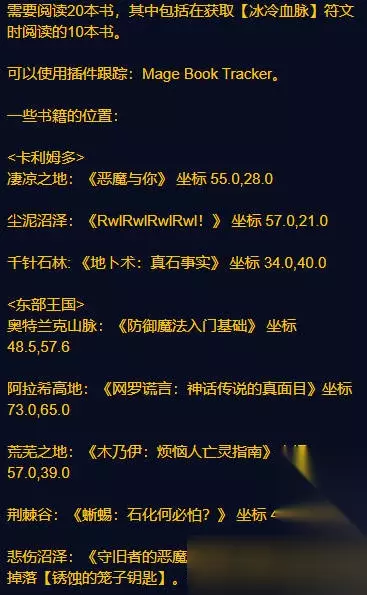 法术强权: 阅读20本书,包括冰冷血脉符文要求阅读的10本。 凄凉之地:《恶魔与你》坐标 57.0,21.0 尘泥沼泽:《RwIRwIRwIRwl! 》 坐标 57.0,21.0 千针石林:《地卜术:真石事实》坐标 34.0,40.0 奥特兰克山脉:《防御魔法入门基础》 坐标48.5,57.6 阿拉希高地:《网罗谎言: 神话传说的真面目》坐标73.0.65.0 荒芜之地:《木乃伊:烦恼人亡灵指南》坐标57.0,39.0 荆棘谷:《蜥蝎: 石化何必怕? 》坐标 41.5.50.8 悲伤沼泽:《守旧者的恶魔宠物照护指南》“失落者"掉落[锈蚀的笼子钥匙]。书在 61.0,22.0 的笼子里