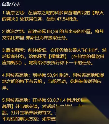 魔兽世界plus二阶段法师符文 冰冷智慧: 1、来到凄凉之地左上方的熄灭的篝火处(47,54)获得任务。 2、来到考米克的小屋(63,39),将任务道具交给npc。 3、来到藏宝海湾旅馆找到女兽人交任务,给她买一杯樱桃酒。 4、来到阿拉希高地(59,91),与阿拉希和湿地中间桥下的船互动。 5、在阿拉希高地(93.8,71.4)的位置找到npc对话,将其击败后可以获得符文。