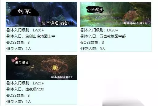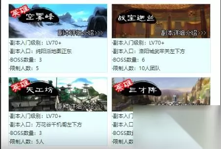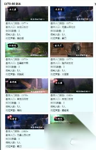 70到80级: 法王窟,无量宫,仙踪林,寂灭厅,毒神殿,英雄-法王窟,英雄-无量宫,英雄-寂灭厅,英雄-毒神殿,唐门密室,英雄-龙渊泽,英雄-荻花圣殿,英雄-荻花洞窟