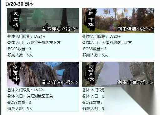 剑三副本顺序介绍 20到30级: 天工坊,三才阵,灵霄峡,空雾峰,剑冢,小仙踪林,唐门密室