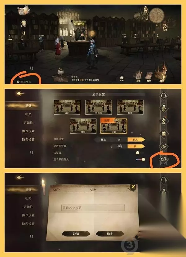哈利波特魔法觉醒兑换码在哪 1、如下图所示,首先进入大厅界面,点击左下角的齿轮,就会来到设置界面。