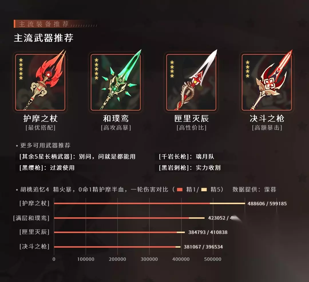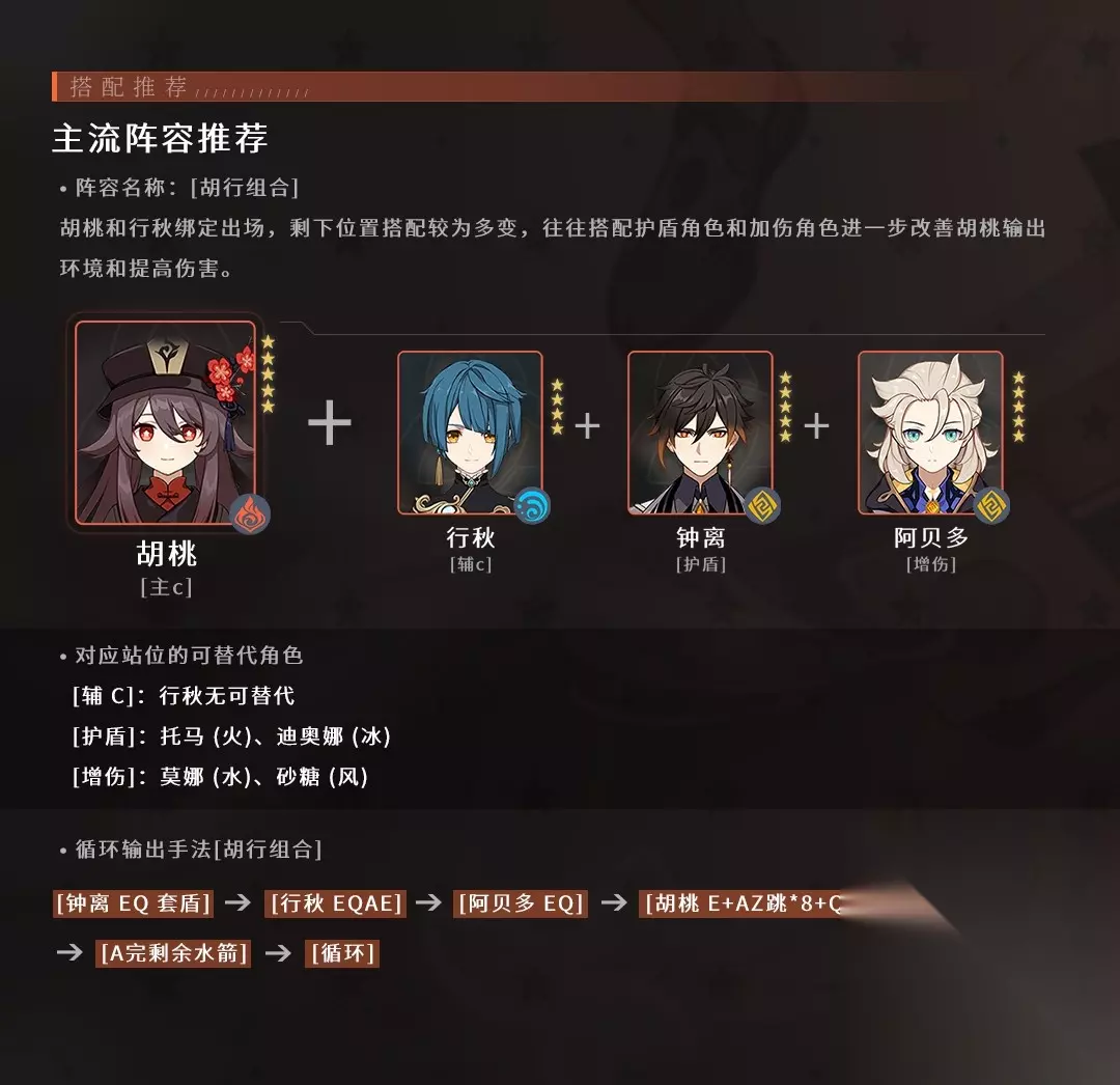 由于是复刻角色,且胡桃出的时间较久玩法基本上已经是确定了,自身锁血输出需要搭配盾辅,钟离为最佳选择托马则是钟离下位,副C行秋是无可替代的,只要胡桃想打出输出务必带行秋副C挂水元素提高伤害,第四个位置就根据深渊或者大世界的敌人目标来选择,如双岩就用上图搭配,伤害最大化。 ep. 胡桃行秋托马万叶 万叶双扩散降低敌人水火抗性,提高队内水火输出,托马护盾提高胡桃的生存能力 双火BUFF的攻击力加成对胡桃几乎没什么用,因为胡桃是基于血量去增加攻击力所以可以无视,托马和胡桃频繁的挂火也可以有效的让万叶的扩散为队伍提供伤害加成。 输出手法:托马释放EQ切行秋EQAE,在切万叶E双扩散释放大招,切胡桃进行E+AZ跳补大招循环输出,打完一套切托马释放技能让自己吃球在进行循环即可。 ( 备注:A:普攻平A;E:元素战技,同时带e和E的输出手法中,e为点按元素战技,E为长按,除此之外E都为点按;Q:元素爆发;Z:重击 ) ▌P2 武器推荐&期望值对比