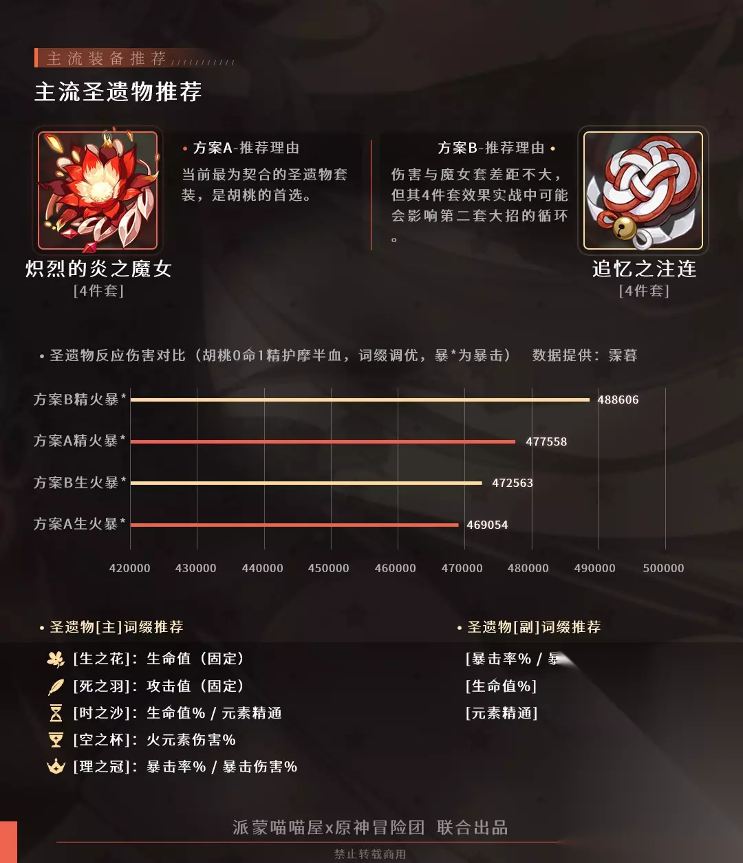 生命沙漏是兼顾输出与生存的优选。 在仅考虑伤害增幅不考虑生存能力的情况下除了匣里灭辰都可以考虑使用精通沙漏。 如果携带和璞鸢、决斗枪优先携带暴伤头,其他武器优先暴击头。 这里采用追忆套主要原因是胡桃的大部分伤害来源于普攻重击(凹伤害除外)所以追忆套效果更好一些,但大招伤害肯定是会所下降,还有一个主要问题就是魔女套是真的不出货。 并且魔女套被动加成虽然看起来非常可观,对于胡桃的话并不像迪卢克这种频繁释放元素战技可以吃满火元素加伤,也不像可莉这种可以用Q取消E的后摇来叠满魔女套效果,所以总体下来一个加成并不多且比较难处的圣遗物性价比一下就体现出来了。 当然如果有成型的魔女套还是优先于魔女套,如果没有合适的魔女4同时队伍里有需要绝缘4的角色,那么追忆4也是不错的选择。 ▌P4 角色天赋&天赋加点选择