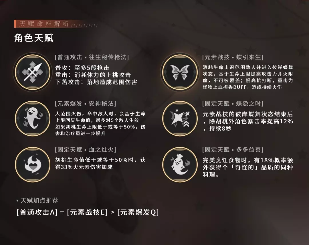 【普通攻击:往生秘传枪法】 与其他长柄武器类似,胡桃的普攻为至多6段,重击为向前突进对路径上的敌人造成伤害,下坠攻击为从空中下坠从冲击地面,攻击下落路径上的敌人,并在落地时造成范围伤害。胡桃除了重击外,倍率数值都不如魈且低空/高空还不如钟离,在实战中往往在E技能持续时间内通过普攻和重击间插打输出。 胡桃的重击会穿过敌人一段距离,重击之后往往还要角色转向才能继续输出效果不好。但重击伤害在穿人前就已经出现了,我们可以在穿人前通过跳跃/闪避取消重击后摇避免角色转向同时节约输出时间。在解锁1命前推荐使用跳跃来取消后摇,解锁1命后可以选择用闪避取消后摇。 0命胡桃用A-重击-跳-A-重击-跳循环;1命胡桃重击不再消耗耐力,可以用A-重击-闪避循环更快一点。A-重击-跳跃循环则更节约体力,对群怪和大世界可以选择骑士4件套节约体力。 —— 【元素战技:蝶引来生】 胡桃的关键技能,开启时胡桃会消耗当前30%生命值,根据自身生命值上限获得一定攻击力加成,胡桃的普攻/重击伤害会转换为火元素伤害且不可被附魔覆盖,同时会提升胡桃的抗打断能力,胡桃下场技能就结束。在E技能持续时间内,胡桃的重击会为命中的敌人附加一个「血梅香」效果,该效果会让敌人每4秒受到一次火元素伤害(同一个目标身上只能存在一个「血梅香」效果,持续时间为8秒)。 E技能通过生命值上限获得的攻击力加成有上限,不能超过胡桃基础攻击力400%,胡桃携带四星武器想要达到上限血量基本要叠到3万5血以上,带五星叠到上限要4万5千以上,3命效果能降低血线需求。但对于大部分玩家来说在目前的情况下很难达到上限。 E技能持续时间为9秒冷却为16秒,有7秒空挡胡桃的输出会比较疲软,在实战中此时会切换队伍中的其他角色(如行秋)开辅助buff,再切回胡桃基本冷却也结束了,所以这7秒对胡桃实际影响不大。胡桃培养切记盲目堆叠血量,通常佩戴生命沙就已足够 —— 【元素爆发:安神秘法】 胡桃的大招,对周围敌人造成大范围的火元素伤害,最多对5个敌人生效。技能CD为15秒,在血量50%以下效果会更好 天赋血之灶火效果也和50%以下血量有关,所以大招往往是在胡桃血量50%以下同时在彼岸蝶舞状态时释放收益最佳 —— 被动天赋 【蝶隐之时】 E技能的彼岸蝶舞状态结束后,队伍中所有角色(不包括胡桃自己)的暴击率提升12%,持续8秒,非常适合速切体系的技能。 小技巧是胡桃可以提前下场结束E技能,后续角色能直接吃到BUFF。 —— 【血之灶火】 胡桃生命低于50%的时候,提升33%的火元素伤害,又是一个控血buff,和护摩之杖相性很好。推荐胡桃打输出时血量要控制在50%以下,不过面对群怪时开启大招血量可能回复到50%以上需要开E技能来降低血量达到输出最大化,因此大家一定要注意血量控制。 —— 【多多益善】 完美烹饪食物时,18%概率额外获得一个「奇怪的」品质的同种料理,这让我想起了隔壁同一cv角色的料理水平。 —— ▌P5 命之座&核心命座