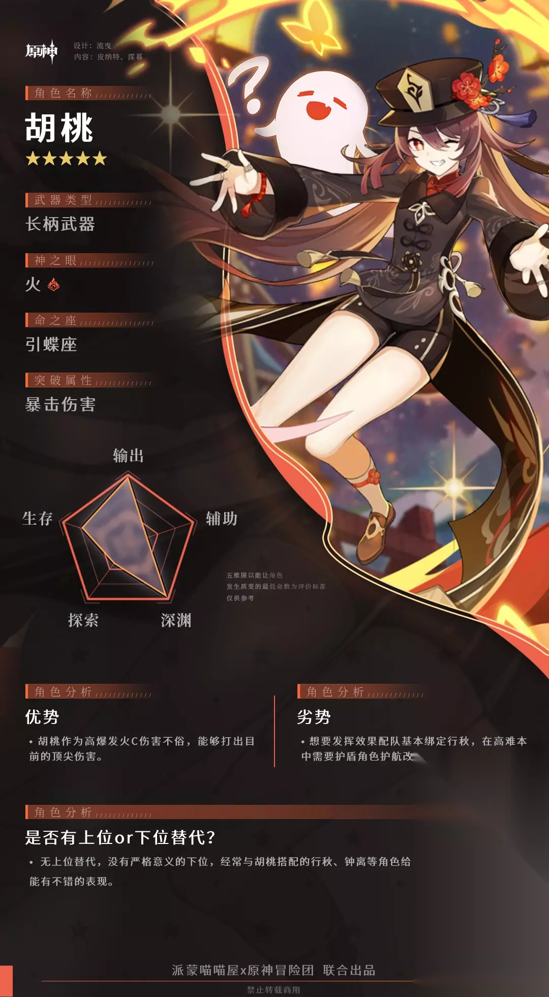 ▌前言&角色展望 既是「往生堂」堂主,也是璃月「著名」诗人,胡桃的每-重身份都堪称奇妙。她总是飞快地出现又消失,犹如闪电与火花并行,甫一现身便点燃一 切。 她午夜写诗,白日奔走,漫游山海,俯仰自得。不仅如此,更会出现在任何时间任何地点。街头巷尾、荒山野岭,明朗晴天、昏黑夜晚..万事万物都有可能,万物万事皆可成为她的奇思妙想。 胡桃的第一次复刻,作为往生堂堂主再来一碑的创始者,上次错过胡桃的小伙伴这次不要再错过了,火元素主C普攻附着元素,大招倍率高且有着很强的回复能力,适用于目前任何环境(火元素目标除外)如果想要胡桃伤害最大化1命加上「护摩之杖」是必不可少的,因为这样这样伤害才能拉满哦~