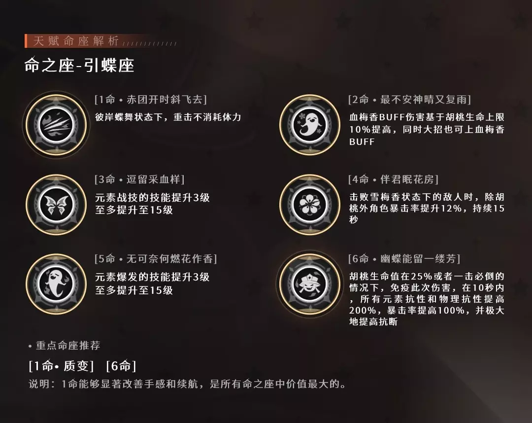 【命之座 第1层】赤团开时斜飞去 处于蝶引来生施加的彼岸蝶舞状态下,胡桃的重击不会消耗体力。 对于打重击流的胡桃来说能显著改变手感,A-重击-闪避体验也更好,多轮输出胡桃的续航也能得到改善,可谓是胡桃价值最大的命之座。 —— 【命之座 第2层】最不安神晴又复雨 血梅香造成的伤害提高,提高值相当于效果附加时胡桃生命上限的10%。此外,安神秘法命中也会为敌人施加血梅香效果。 伤害锦上添花,如果没有抽3命的打算不必抽2命 —— 【命之座 第3层】逗留采血色 彼岸蝶舞的技能等级提升3级,有了这个命座最大的区别就是能让玩家在追求E技能血量转化攻击力上能降低血上限,从而留出更多词条叠双暴等内容。 12级E技能比9级E技能和节约6000血上限(也可以说是送了玩家40%生命副词条),提升也十分可观。 —— 【命之座 第4层】伴君眠花房 有4命胡桃的氪佬深渊可能一个流程带走了,如果队伍除了胡桃没有其他输出核心提升有限。 —— 【命之座 第5层】无可奈何燃花作香 这个技能在命座3的光芒下就不是那么耀眼了,提升大招等级中规中矩。 —— 【命之座 第6层】幽蝶能留一缕芳 氪佬玩具,据说体验不错,战斗中不用担心暴毙心态更平和,而且还能借机打出爆炸输出,但对于普通玩家来说并不是必须品不必强求。 —— ▌P6 角色培养材料