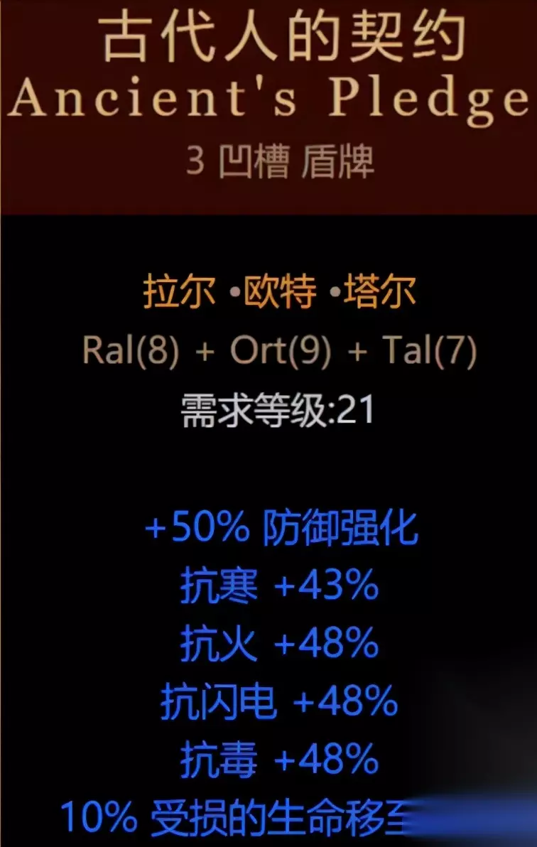 隐秘 第二个就是我们的古代人的契约了,底材需要一个三孔的盾牌(商店就可以直接刷出来了),符文需要8号、9号、7号,也是很好获得的了。古代人的契约主要能提供大量的全抗,四抗直接提供40+。有了它在普通级别和噩梦级别基本不用担心抗性不够了。