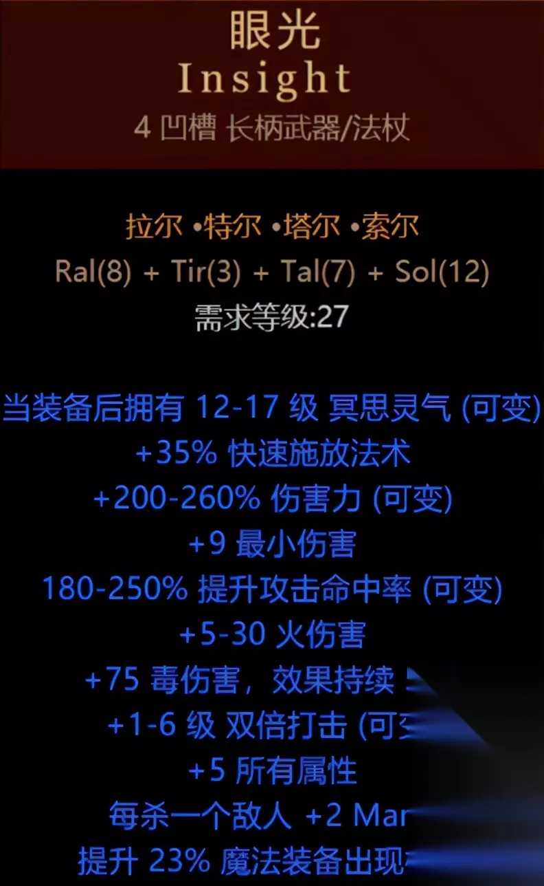 精神 第四个极力推荐的就是眼光了,底材四孔长柄武器(矛叉之类不能做哦),符文由8号、3号、7号、12号构成,基本噩梦难度前都能够刷到。基本上法系职业的第二幕雇佣兵必穿。主要眼光提供12~17级的冥想光环,可以大幅度提供我们角色的回蓝速度(可以不带蓝药水了)。其次本身眼光的攻击也不低,雇佣兵带上也能打出很不俗的输出了。