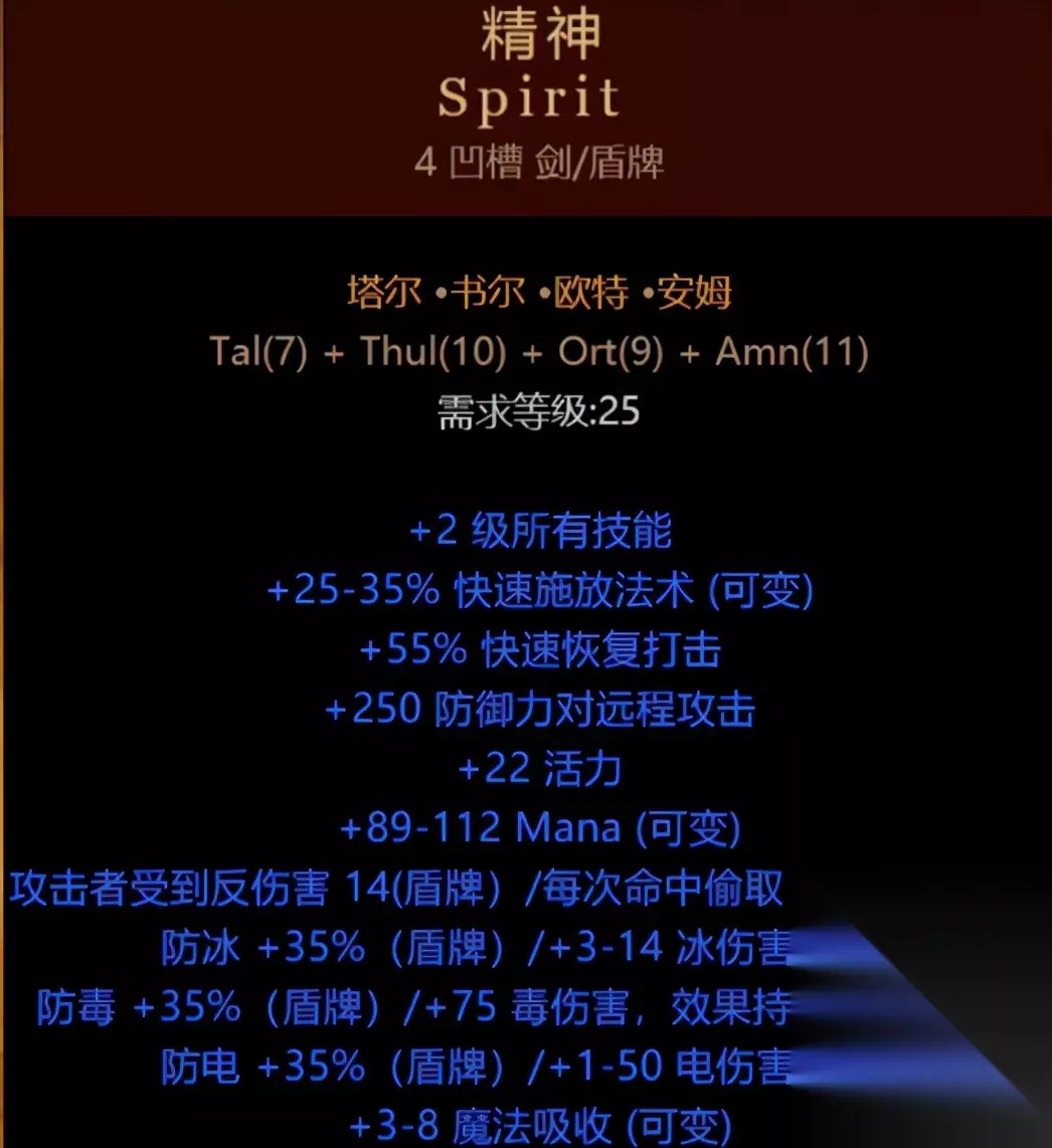 古代人的契约 第三个就是精神了,精神作为万金油装备,可谓是真正的性价比之王了,底材为4孔的剑/盾牌(四孔剑前期很好获得,盾牌我们讲通用的君主盾只能在地狱难度获得,所以前期正好可以古代人的契约过渡),符文由7号、10号、9号、11号构成,只需要由这个四个低等级的符文就可以获得+2所有技能、最高35%的快速施法、55%的打击恢复、等大量属性。