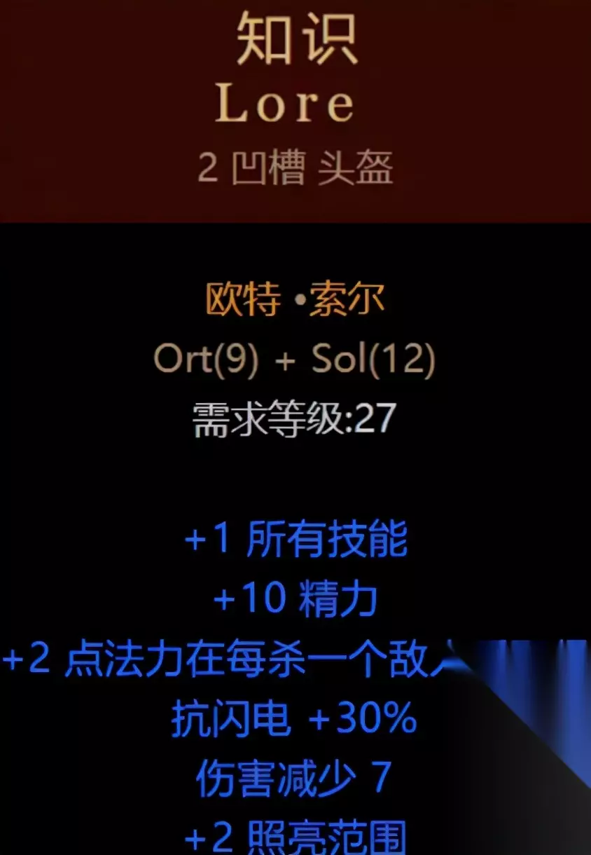 眼光 第五个就是知识头盔了,底材两孔头盔,由9号、12号构成,提供+1技能、10精力、30%抗电,击杀回蓝,感觉有这头盔法师都可以一直穿到有了军帽为止了
