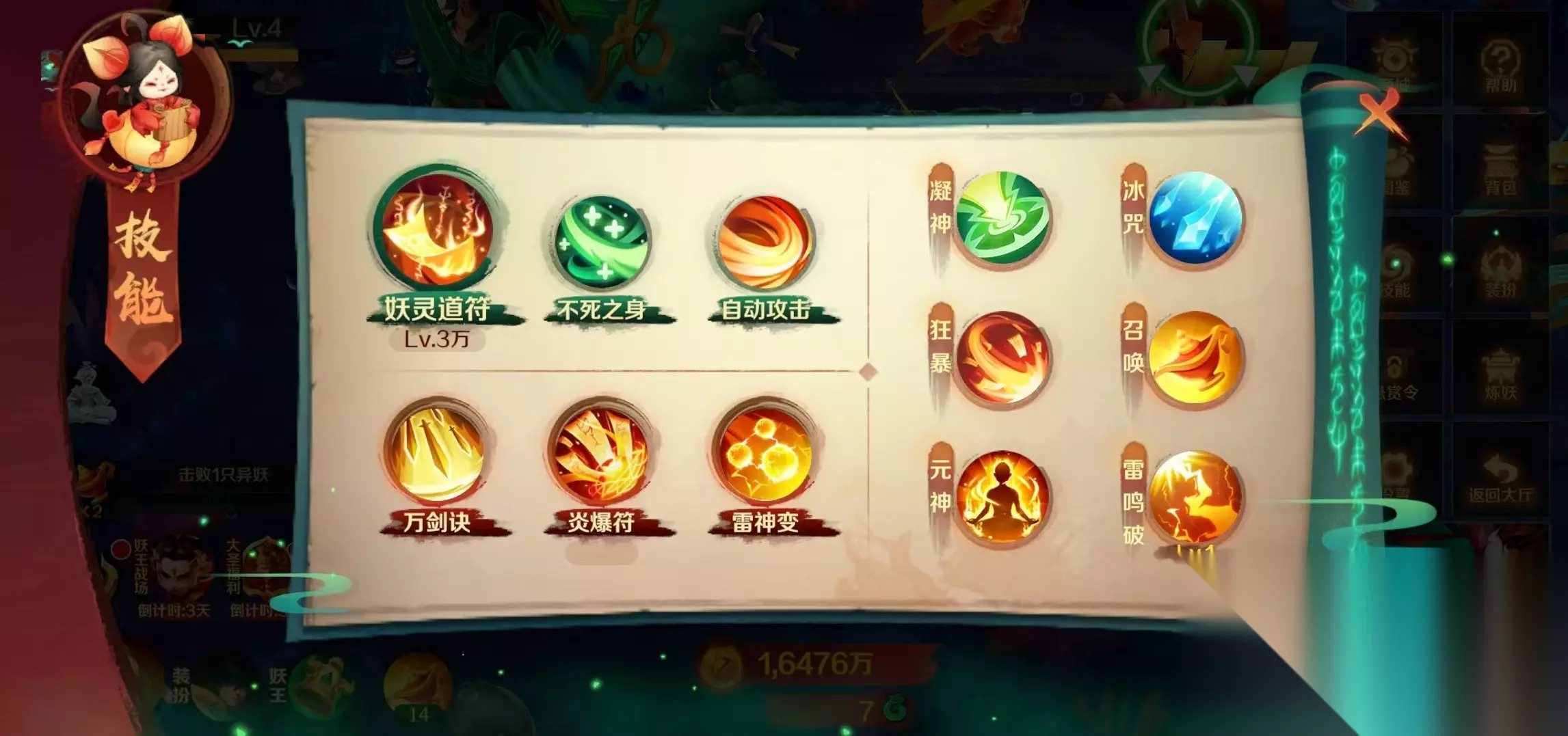 大家在战斗的过程中也要注意一些技巧,首先是技能搭配,在面对数量众多的群体怪物时,选择一些范围伤害高的群攻技能,在面对boss时,就改为控制和单体高伤害技能。灵活运用闪避技巧躲避敌人的攻击,在敌人攻击落空的瞬间抓住机会进行反击。道符升级主要是通过挂机战斗、完成任务和活动等方式来获得经验,提升道符等级后便于击杀更强大的敌人。最后是要积极参与炼妖玩法,击败大妖数量达标后可以进行炼妖,有机会刷新奖池,获得大量妖灵奖励。