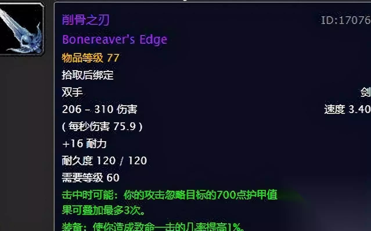 削骨之刃:虽然这个削骨之刃的外形一般般 但是这把武器确实很强,就PVE的一个情况来讲,它和al相比那是丝毫不逊色的,我们来看看削骨的一个属性,每秒伤害也是达到了75.9,而且加16耐力。绿字属性则是加1%的暴击,以及忽略攻击目标700点护甲值,而且还可以叠加。