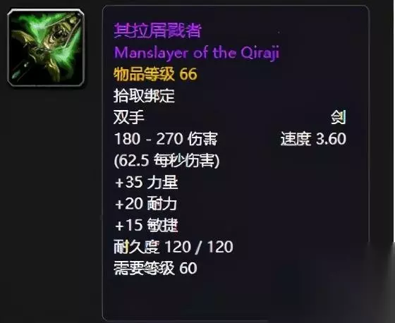 其拉屠戮者:掉落于拉贾克斯将军,这是一把非常强力的双手剑,提供了高额的三位属性加成,伤害也是非常的可观,我们来看看它的一个属性,每秒的伤害在62.5。而且白字属性很全面,装备后可以获得35点力量20点力量以及15点耐力,还是很不错的。