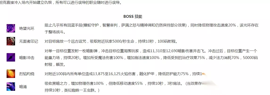 一技能绝望光环,阻止玩家几乎所有的回蓝手段,同时降低物理攻击速度20%,该光环存在整场战斗。 二技能无面者印记,对随机玩家释放一个诅咒,吸取附近的玩家5,000每秒的生命值,BOSS回血持续10秒,同时这个诅咒是无法解除的。 三技能暗影冲击,对随机玩家目标位置发射一枚暗影弹,冲击目标位置周围造成1.2万的伤害并击飞,目标位置会产生一个能量场,增加施法速度100%,减少法力消耗百分之70。 四技能烈焰灼烧,读条2秒对附近100码的所有单位造成1.5万的火焰伤害,融化护甲75%持续10秒,此技能可打断。