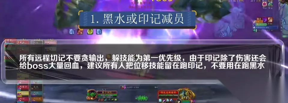 如图所示,MT把BOSS拉在正中间,治疗和近战站在BOSS身后,远程分两点平均站位,中了黑水点名集体平移躲黑水,然后中了无命者印记的人,单独往大团后方跑即可。除此之外,远程只需要站在黑水上疯狂输出即可。 减员点分析