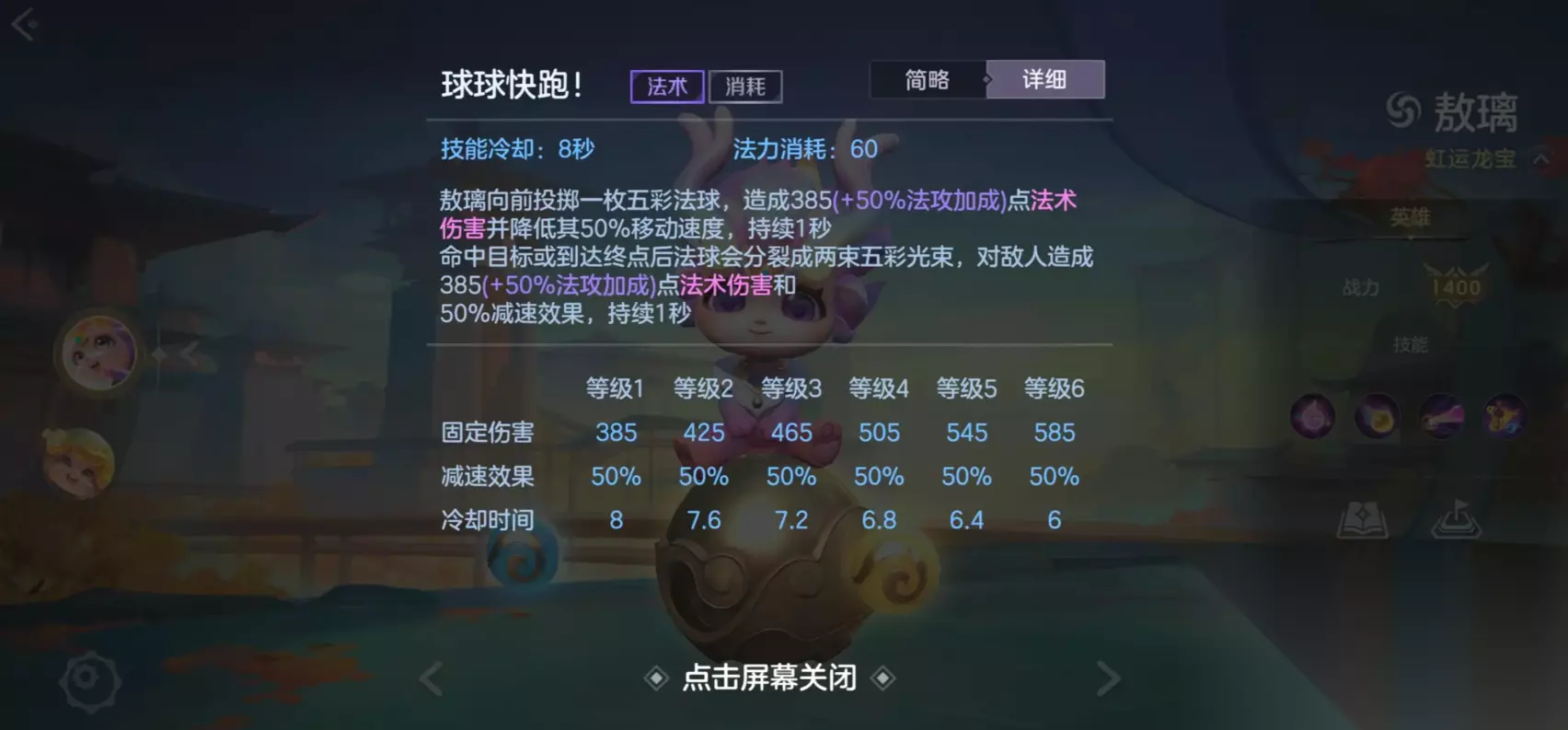 重点提醒:凝滞状态下,目标受到的法术伤害会额外增加75%,但受到的物理伤害会降低50%。所以触发凝滞后,尽量配合己方法师输出,避免己方物理英雄盲目进场,反而浪费控制效果。另外,凝滞效果对霸体单位无效,且触发后无论是否成功控制目标,都会清空所有印记,需要重新叠加。 一技能:球球快跑!—— 爆发与探草神器 敖璃的爆发技能之一,技能释放后会发射一枚法球,命中敌方单位(英雄、野怪)或飞行至最远距离时,会分裂成多枚小法球,对范围内敌人造成伤害和减速效果。这里有个小细节:一技能的伤害判定点只有一个,有时候贴着敌人脸释放反而打不出伤害,这是正常现象,不用慌。 用法推荐:前期可用于清线、远程消耗,团战中用来叠加被动印记,也可以先手探草,避免被敌方刺客埋伏。分裂后的小法球能覆盖更大范围,打团时尽量瞄准敌方密集区域释放,最大化伤害收益。 二技能:快看彩虹!—— 持续输出核心
