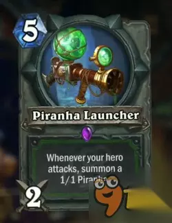 猎人史诗武器卡 每当你的英雄攻击时,召唤一个11的食人鱼具有野兽属性 这张卡怎么说呢,比较亏节奏,5费有点太高了。 不过能全部攻击完一回合一个11打防战这种卡组还是不错的。 炉石传说龙争虎斗加基森新卡战术撤离图文介绍: 图鉴: