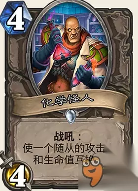 属性: 在你的回合开始时,对该随从造成2点伤害。 评价: 这张牌或许被过分高估了,虽然看起来身材是337,实际上这张牌是可以当335来看的,而且下一回合就变成333了。 JJC中看到了可以考虑抓,毕竟3费准时下的话可以吃掉不少怪了,但由于异能的局限性,很多时候都非常坑爹。 构筑中倒是非常不错的牌,牧师带的话。 萨满的治疗图腾也可以稍微减轻一下异能的副作用,属于比较优质的构筑牌。 炉石传说龙争虎斗加基森新卡化学怪人厉害吗? 图鉴: