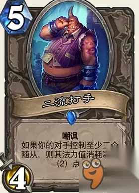 属性: 战吼,使一个随从的攻击力和生命值互换。 评价: 相当于是4费的炼金术士,身材44倒是感觉不是特别亏,毕竟554的牌也有很多。 异能在很多时候都非常有用,比如碰到部分435这种,3费的卡很多都是334这种身材,JJC偶尔会有奇效。不过由于身材和异能的不稳定并不是那么推荐去拿。 JJC在快攻手中会有奇效,其他时候就当一个弥补曲线的抓吧。 构筑中一般不会考虑带,即使是吼爹炼金也不需要带这个,毕竟费用太高。 炉石传说龙争虎斗加基森新卡二流打手怎么样? 图鉴: