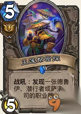 属性: 获得10点护甲或者是返还你所有法力水晶。 评价: 到10费后相当于0费下了一个77或者是10点护甲+77。 挺实用的一张牌,不过并不要抱太大期望,毕竟10费了。很多巨人在10费也可以用非常低的花费下下去的。 JJC看到了可以抓,毕竟免费的10费77,当然有更多更好的橙卡,比如说伊瑟拉大螺丝感觉比这张卡都是毫不逊色的。 构筑中非常不错的牌,毕竟有激活,可以提前下这个。 炉石传说龙争虎斗加基森新卡玉莲帮密探解析: 图鉴: