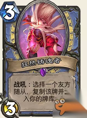属性: 发现一张具有嘲讽的随从。 评价: 战士的优质嘲讽随从有334和426,这两张都非常的不错,不过中立的嘲讽目前还是有很多地雷的。 比如112和314等等,强力的有9费的滑稽者这种都是非常不错的。 JJC肯定是必抓的,发现在JJC都是特别强力的卡。 至于构筑还需要看情况,目前嘲讽战卡组还得观望一下。 炉石传说龙争虎斗加基森新卡狂热铸魂者怎么样? 图鉴: