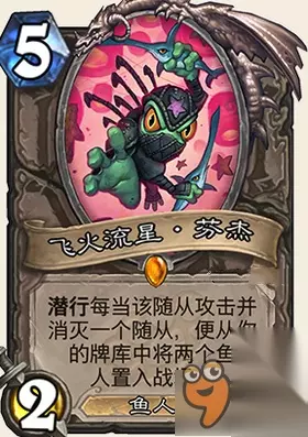 属性: 战吼,发现一张德鲁伊,潜行者或萨满的职业牌。 评价: 553的身材实际上是非常强的,参考法师的虚灵巫师,这张牌和那张比起来还是差了一点。 因为潜行者的地雷很多,比如转刀这种,容易发现几张特别坑爹的牌。好在几率不大。 JJC碰到了必拿,万一抓到橙了呢?即使没抓到抓到高质量随从,强力解场等等都是特别赚的。 构筑中非常不错的牌,没有好的5费完全可以下这个。 龙争虎斗加基森新卡食人鱼发射器怎么样? 属性如下图: