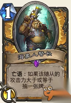 属性: 从你的牌库中抽3张1费的随从卡。 评价: 这张牌怎么说呢,可能在构筑中会有奇效。 佛祖骑带着张有意外收获。 骑士121无名的英雄非常的赚,奥秘守护者也是一样的。 另外骑士这个版本还多出了一个可以回收随从的奥秘,配合起来或许相当不错。 JJC基本不考虑抓,JJC除了术士其他职业1费多了容易炸。 构筑非常不错的牌,3费费用有点高就是,容易亏节奏。 炉石传说龙争虎斗加基森新卡海象人警长怎么样? 图鉴: