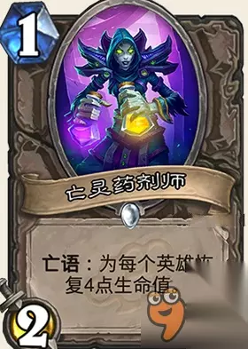 属性: 在你的回合结束时,恢复英雄1点生命值。 评价: 标准身材223,恢复生命值这个异能基本可以无视,除了配合牧师的435和纳鲁之光以外基本意义不大了。 JJC中一般抓也是为了弥补曲线,223毕竟基本身材,效果算是附带的。 构筑中感觉挺一般的卡,2费有更多更好的选择。 炉石传说龙争虎斗加基森新卡亡灵药剂师怎么样? 图鉴: