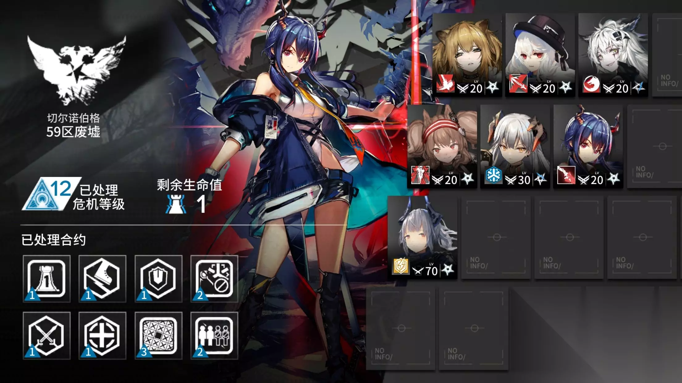 练度: 精2推王 2技能(为了单切法师刚精了2 精1满级其实也可以切了 但有点极限 算上潜能还是精2稳) 精2 20 专2 2技能拉狗 (主力输出之一) 精2 30 塞爹 1技能 (主力奶) 精1 70 雷蛇 1技能 (主T 因为1技能的不确定性所以不太稳所以精2会比较好 换熊sir和其他T理论上也可) 精2 20 幽灵鲨 2技能专1 (主要处理上路和右边冒出来的法师 不满潜需要等级再往上拉 精2) 精2 20 专1拔刀陈 (主输出之一) 精2 20 杰哥 带2技能 (主要处理上路 打残红刀哥 辅助幽灵鲨回血) 威胁选择: 防御点1 移动速度+50% 防御+50% 禁术士和医疗 攻击提升15% 生命提升25% 10个位置不可布置干员 最多编入7名干员 站位: