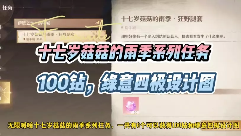 这是《无限暖暖》的十七岁菇菇的雨季系列任务全攻略,包含腿套、手套、耳饰等饰品获取指引,图中展示了绿意四极耳饰的线索,还有任务中与菇菇人对话、场景移动等完成步骤,助力玩家完成任务获取对应饰品。