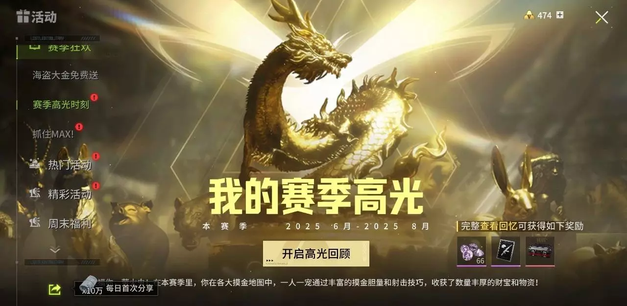 赛季末狂欢已开启,可别忘了解锁你的赛季高光时刻!无论是对局撤离数据,还是大金图鉴都一览无余,回顾高光时刻更能获取镭钻等奖励哦!一起回顾摸金来时路,大金不止,猛攻不息!