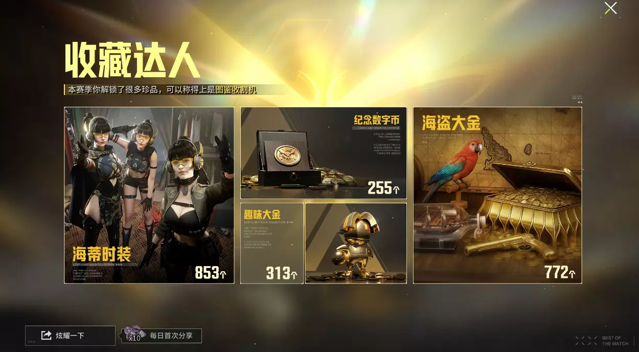 萤火虫们完成条件即可获得海盗大金自选箱,一边集齐大金的同时,还能再额外获得海盗大金,没集齐的萤火虫可要抓住赛季末上车机会来集金啦!