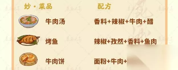 牛肉汤 香料+辣椒+牛肉+醋 烤鱼 辣椒+孜然+香料+鱼肉 牛肉饼 面粉+牛肉+香料+鸡蛋 狼牙土豆 孜然+香菜+辣椒+鸡蛋 番茄鱼面 面粉+番茄+香料+鱼肉 香菜拌皮蛋 香菜+皮蛋+辣椒+醋