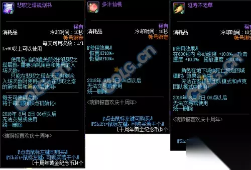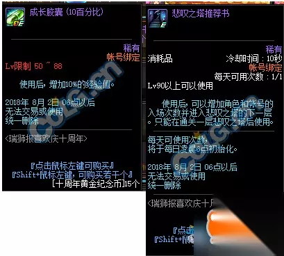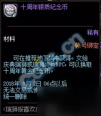 活动时间: 2018年6月19日——2018年8月2日 活动内容: 在活动期间在推荐地下城中可以十周年银制纪念币,用10个银制纪念币可以兑换一个黄金纪念币。 用黄金纪念币可以兑换活动奖励。