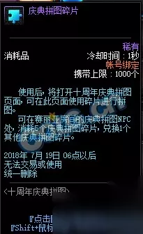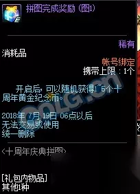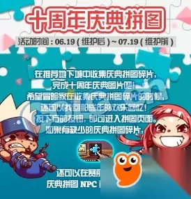 活动时间: 2018年6月19日——2018年7月19日 活动内容: 在推荐地下城消灭怪物收集[庆典拼图碎片]完成十周年庆典拼图,完成1张拼图可以获得[十周年黄金纪念币],完成所有拼图还可以获得1张[角色更名卡]