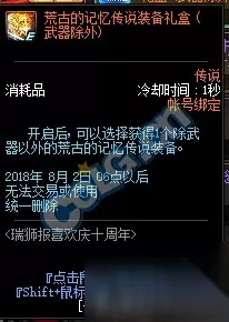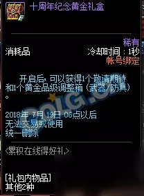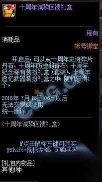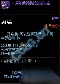 开启后可以从十周年史诗碎片丹石、十周年防虚弱青石、十周年纪念稀有装扮礼盒、十周年追忆武器装扮礼盒中随机获得一个。