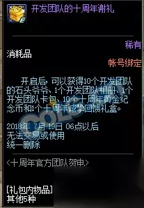 开发团队的谢礼开启后可获得10个开发团队的石头爷爷、1个开发团队相册、1个开发团队卡包、10个十周年黄金纪念币和1个十周年诚挚回馈礼盒。