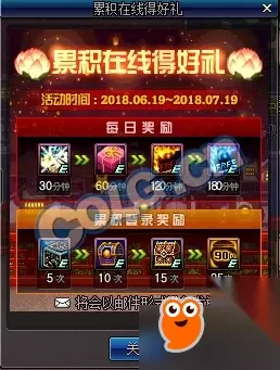 活动时间: 2018年6月19日——2018年7月19日 活动内容: 在活动期间每天上线并且累积在线时长达到30分钟、60分钟、120分钟、180分钟即可获得各种好礼。 累积在线3小时满5次、10次、15次、25次的终极奖励更加诱人。 活动奖励: