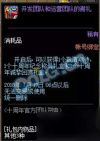 开发以及运营团队的谢礼开启后可获得1个十周年纪念称号礼盒和1个十周年诚挚回馈礼盒。 十周年好礼大放送