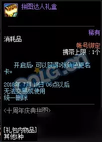 完成所有拼图可以获得拼图达人礼盒,里面可以开启获得一张角色更名卡。