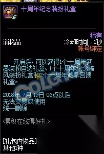 累积在线10天可获得一个十周年武器装扮自选礼盒、一个十周年纪念披风和两个十周年诚挚回馈礼盒。