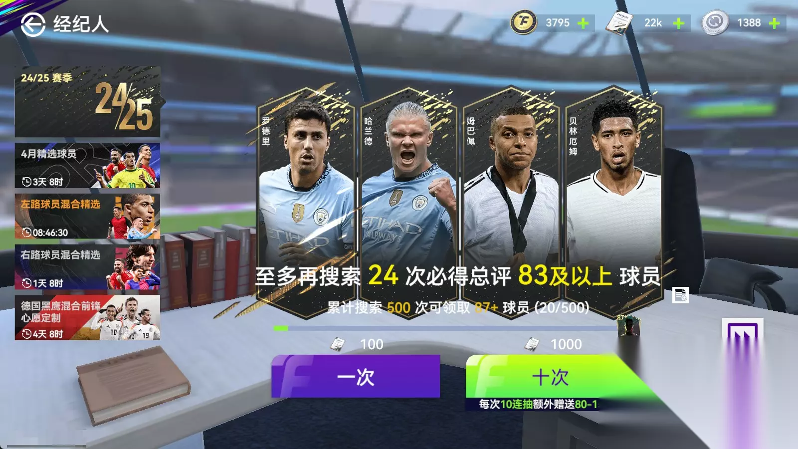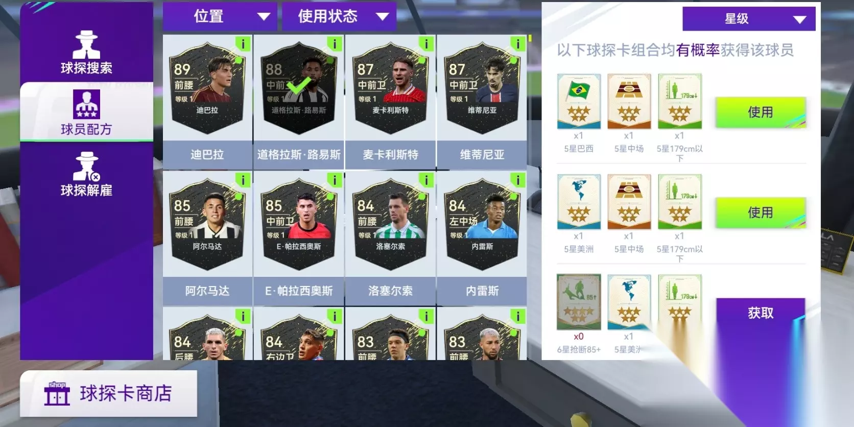 主帅可以在自己的球探库里选择三个不同类型的球探卡进行球员搜索。不过我建议各位主帅进入球员配方按照想要配方来搜索球员。